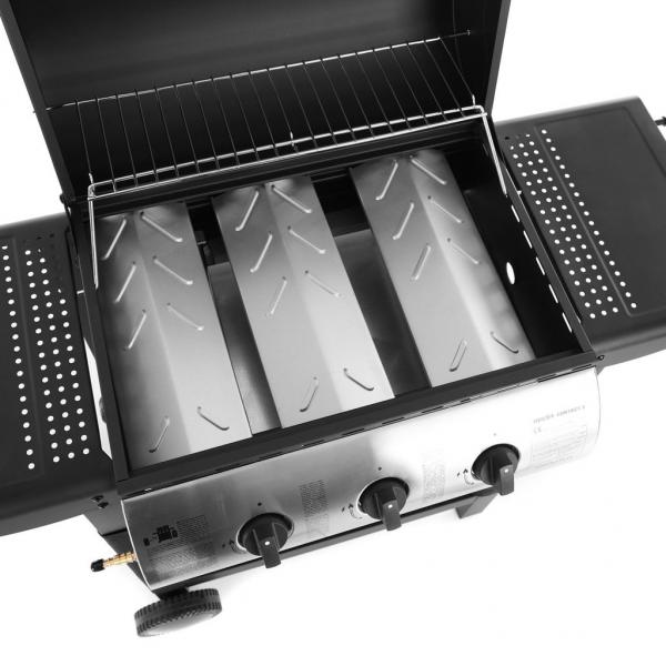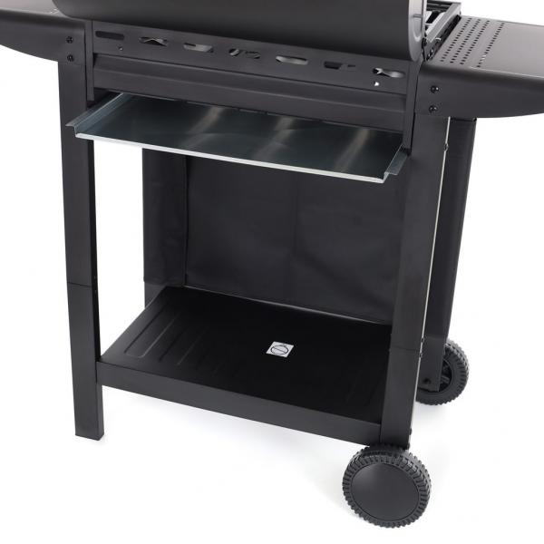 3 adjustable burners with a power of 8.4 kW. Work surfaces on the sides. Rear grill for warming or roasting. Wheels for easy transport. Integrated thermometer on the lid for checking the grilling temperature. Propane-butane gas grill. 3 main burners, total power 8.4 kW. The total grilling surface size is 61 x 41 cm. With the lid closed, the grill is 101 cm high, 98.6 cm wide and 48 cm deep. Reducer and hose not included.