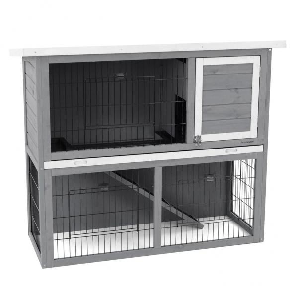 Pull-out plastic drawer, bitumen roof, 2 separate doors on the upper floor, 2 mesh doors on the lower floor. Possibility to close the passage between floors. Made of durable spruce wood.