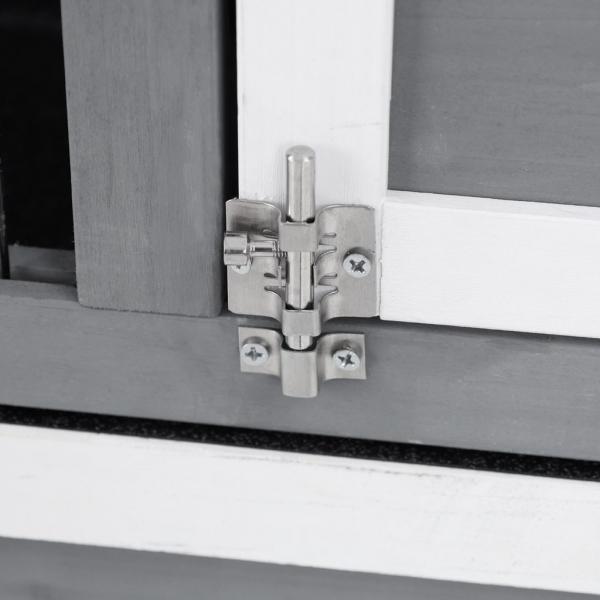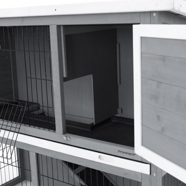 Pull-out plastic drawer, bitumen roof, 2 separate doors on the upper floor, 2 mesh doors on the lower floor. Possibility to close the passage between floors. Made of durable spruce wood.